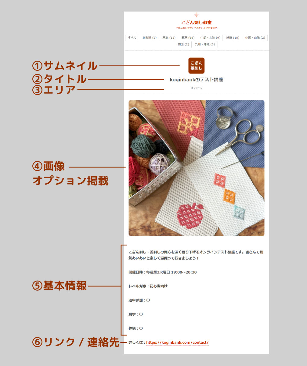 ⑥は講座開設側が用意するURLの記載、もしくは問合せ窓口として、メールや電話番号等を頂いた場合はそれらが表示されます。