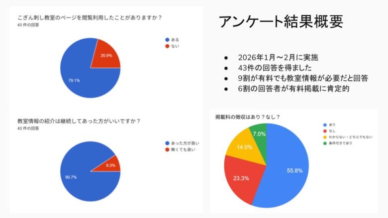 そのため、これまでのようにコストをかけずに情報を更新し続けることが難しくなり、「存続の方法」として有料での運営を模索しておりました。ただ、こぎん刺しや菱刺しの教室には、大手カルチャースクールもあれば、趣味の延長として運営されている小さな教室も多くあります。そのような中で、有料掲載が本当に教室運営者さまのメリットになるのか、私たち自身不安があり、2026年1月にアンケートを実施しました。結果、43名の方から回答にご協力いただき、貴重なご意見も賜りました。